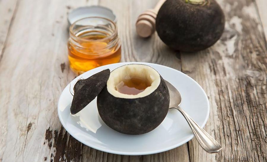 1. Нужно взять одну среднего размера черную редьку, тщательно ее помыть, потом срезать ей верхушку, которая послужит крышечкой. Нужно использовать тонкий и острый ножик и им извлечь из средины часть мякоти. Получится небольшой котелок внутри редьки. И в него нужно положить 2 чайные ложки меда, а сверху накрыть крышечкой (срезанной верхней частью). Мед не должен полностью покрывать углубление в редьке, ведь необходимо место для образования сока.