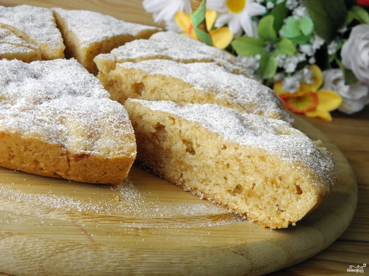 Молоко добавляется в смесь только через 15 минут. Выпечка режется на порционные кусочки, употребляется с чаем. Можно разделить на 2 части корж, пропитать его сладким сиропом, покрыть заварным кремом.